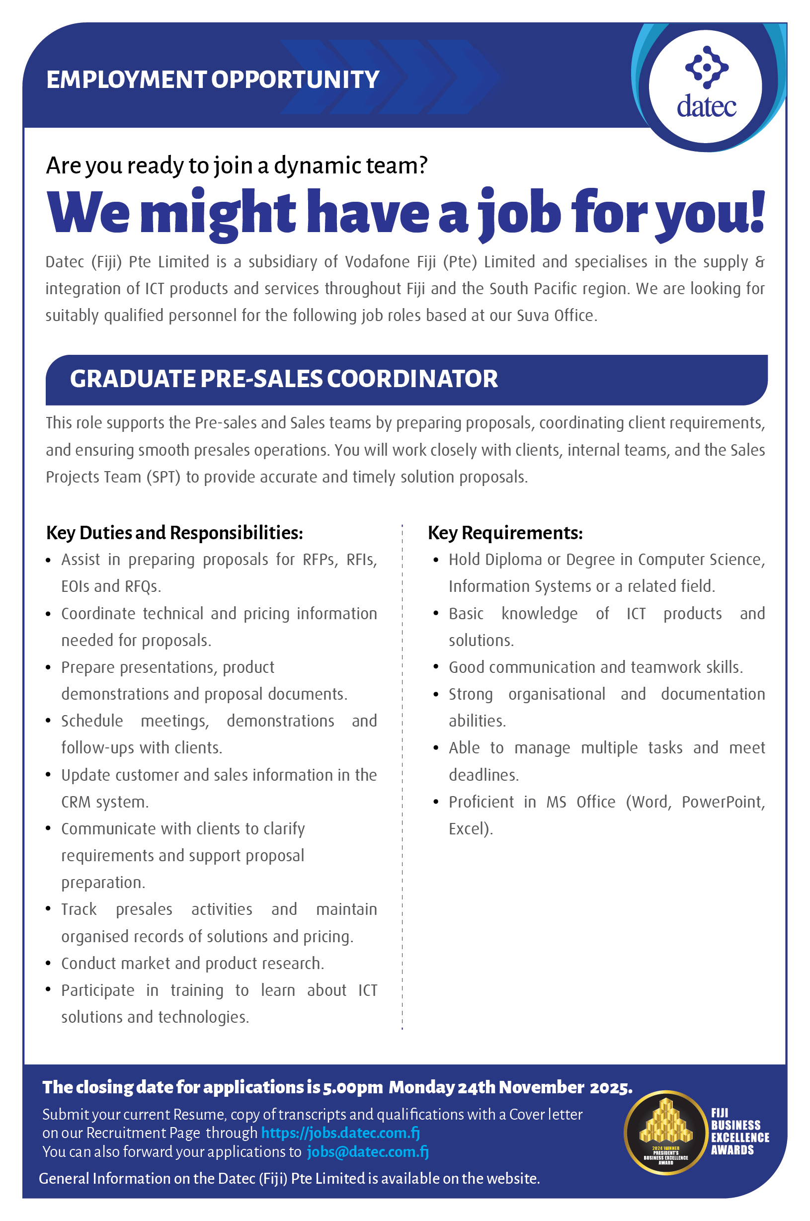 Call Us: +679 331 4411    Email Us: jobs@datec.com.fj