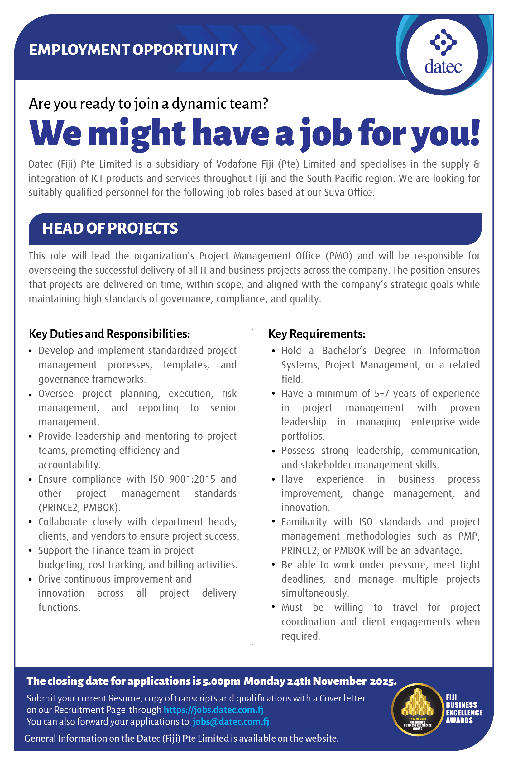 Datec (Fiji) Pte Ltd Full Time Fiji, Nadi, Suva Administration - Development - Finance - ICT - Logistics - Marketing - Training