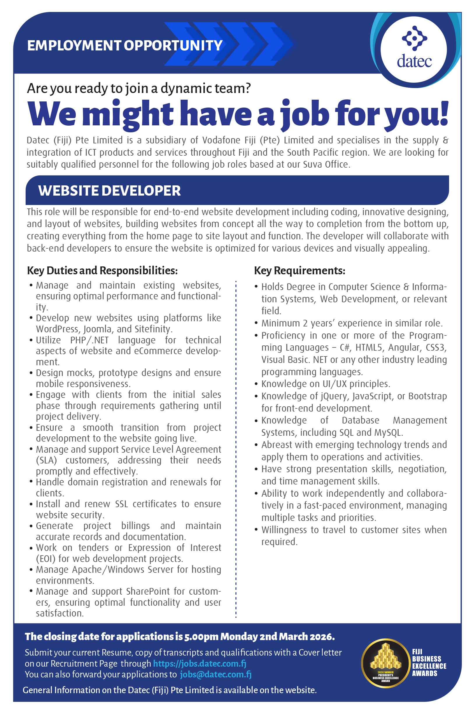 Call Us: +679 331 4411    Email Us: jobs@datec.com.fj